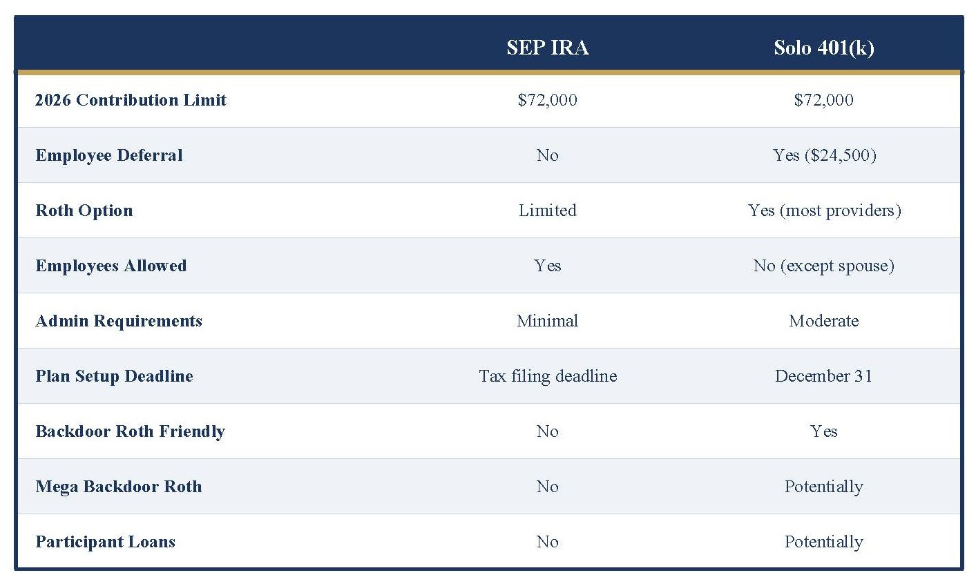 For someone who values simplicity and flexibility, the SEP’s lower maintenance can be a real advantage. For someone willing to manage the admin requirements in exchange for greater contribution flexibility and planning options, the Solo 401(k) can be worth the overhead.